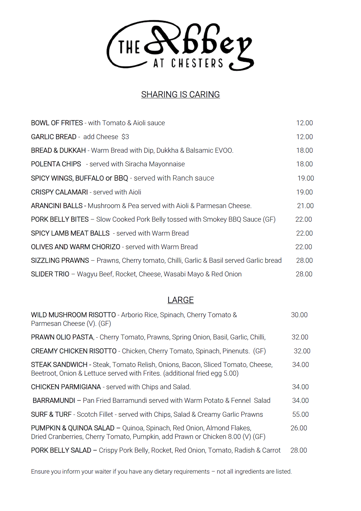 Menu pricing and items are subject to change according to seasonal produce and availability. Feel free to contact us for further confirmation if this is a problem. Please also ensure you inform your waiter if you have any dietary requirements as not all ingredients are listed